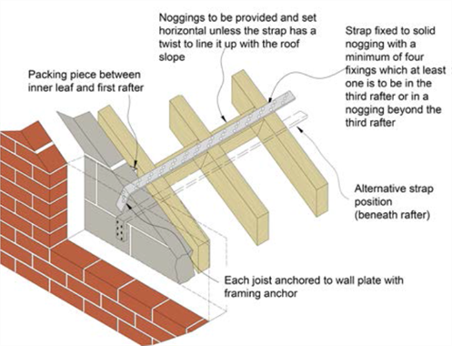The rear gable end of the main part of the property leans out about 150mm above first floor level. Measurement with a spirt level suggest that the top fifteen course of bricks lean out from above the point at which two large longitudinal structural roof timbers bear into the wall. The top ten course of the wall are of single skin construction and particularly vulnerable to further movement.