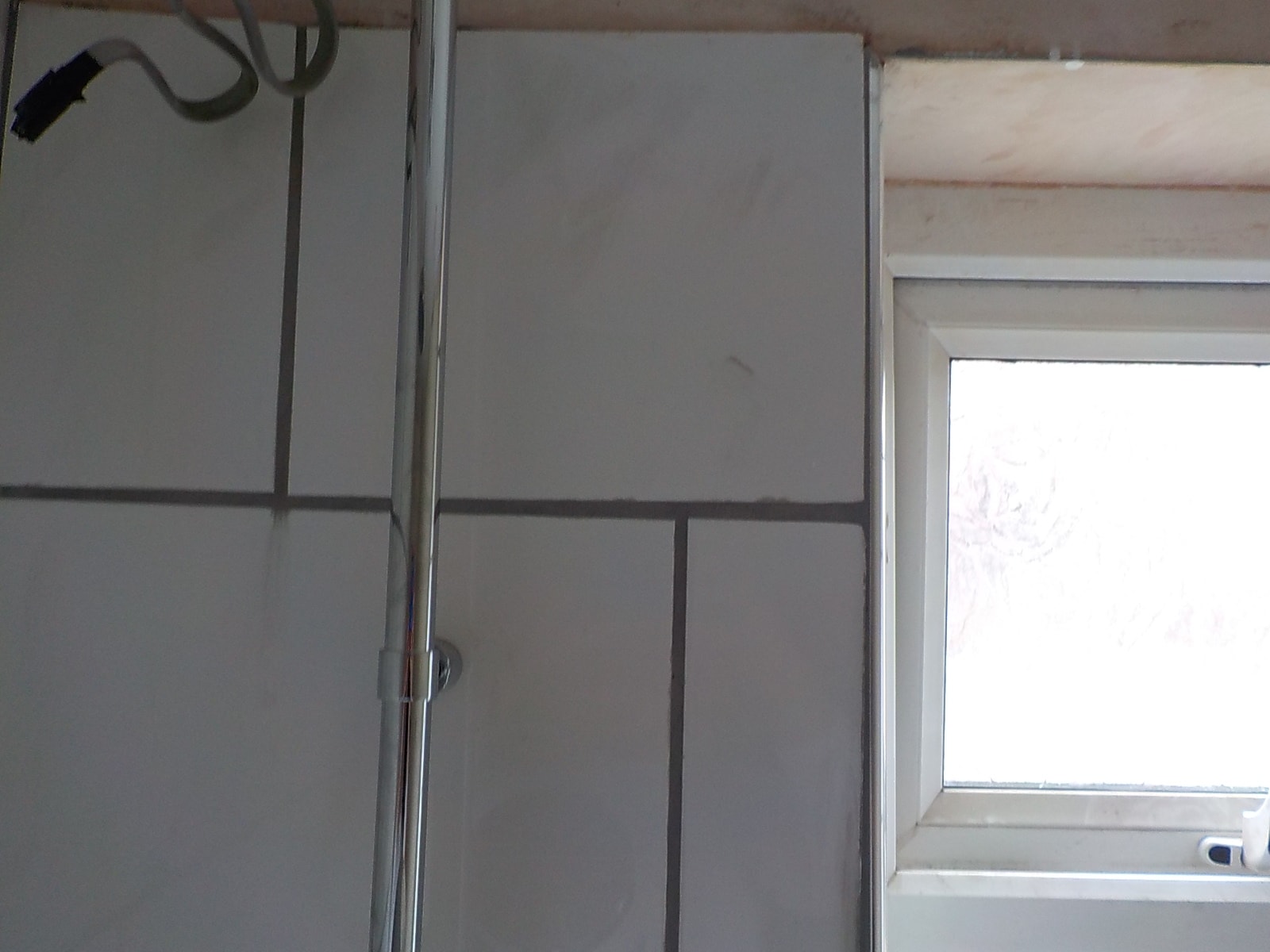 Grout left on the bath. No angle bead used in the corner. Tiles on one side of the corner are not level with those on the other. Note the level of the tiles below the window