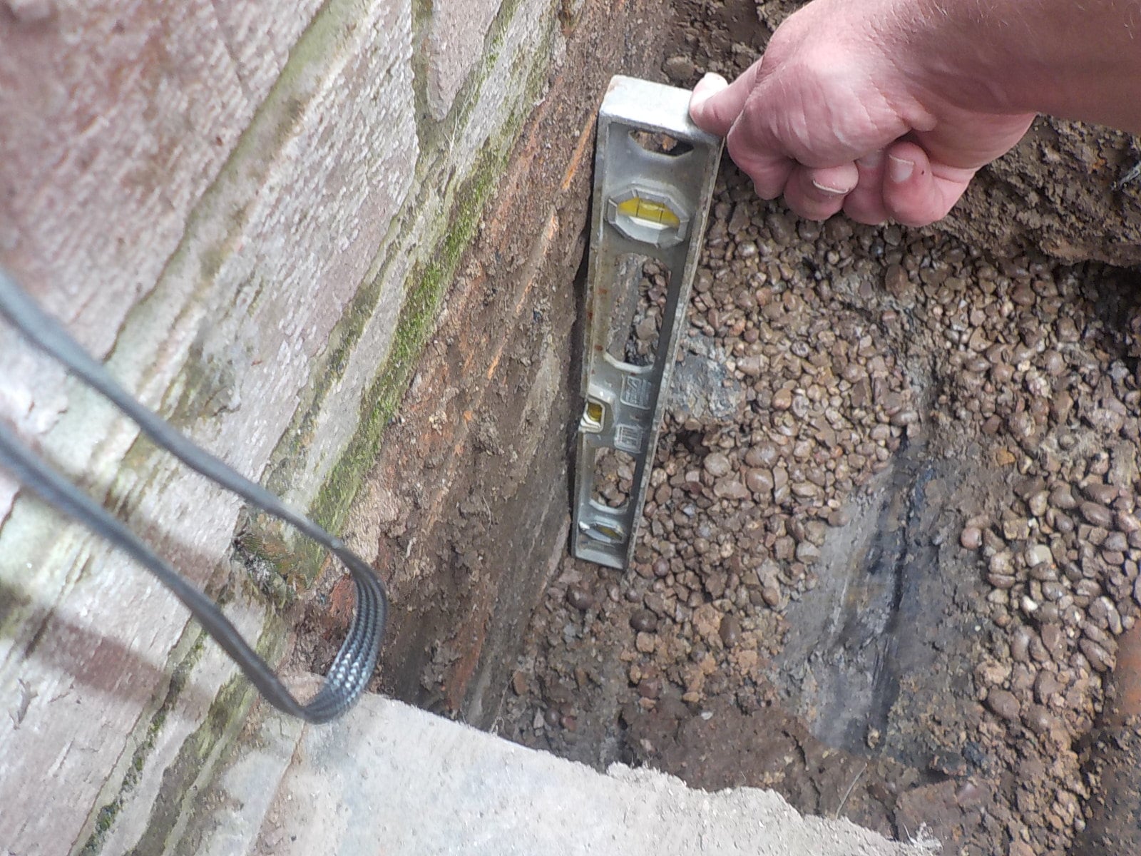 The wall had a very good foundation which can just be seen to the right of the hole. The drian is bedded in gravel along its length so that should it fracture there is an easy path for the water to follow.