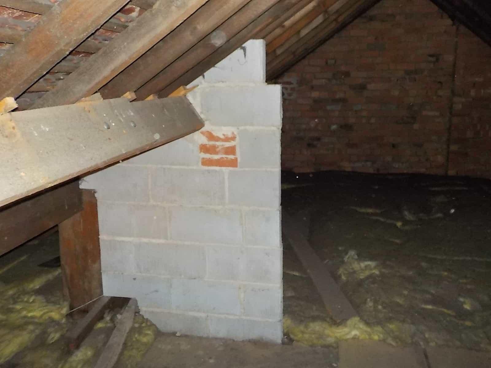 Provision of an additional horizontal timber to help support the rafters. Note the wedges to ensure that the rafters are bearing on the new timber. The bricks in the new wall are to ensure that the timber cannot break the blocks which may not be suitable as a bearing. It would have been preferable if the bricks had been laid in a stepped pyramid shape to help spread the load over a wide area of the blocks